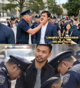Samantala, hindi nagmamadali si Manny. Tahimik niyang tiningnan ang mga nanonood sa paligid na tila sinasabi sa kanila na obserbahan ang nangyayari. May matututunan kayo. Hindi lang ito tungkol sa sampal o sa galit ng pulis. Tungkol ito sa respeto, dignidad, at tunay na kapangyarihan na hindi nakikita sa anyo ng uniporme. Habang lumalaki ang tensyon, isang matandang residente sa gilid ng kalye ang lumapit at tahimik na nagtanong, “Sino ba talaga siya? Bakit tila wala siyang takot?” “Si Manny Pacquiao,” sagot ng isa pang manonood, “ang pambansang kamao. Hindi siya pwedeng tumayo lang diyan.”