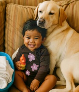 Nakatayo si Mark sa pinto, hawak pa ang susi, at nakatingin sa anak niyang si Emma, nakaupo sa gitna ng sofa, naka-cross legs. Maliit pa ang mga daliri nito, chunky at inosente, hawak ang isang pulang laruan na umiingay kapag pinipisil. Ang buhok niyang kulay light brown ay bahagyang kulot sa dulo. Sa likuran niya, nakadapa si Buddy, ang kanilang dilaw na Labrador — nakadikit ang dibdib sa likod ng bata, at nakapatong ang baba sa ulo nito — parang aninong buhay.