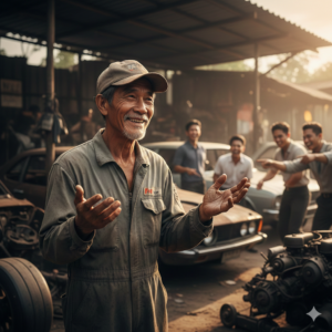 Sa sandaling iyon, humakbang si Adriano at ang tunog ng kanyang sirang tsinelas ay mahinahong tumama sa semento. Ang tatlong mekaniko ay lumingon sa kanya, halatang nagulat. Kumitig ang mukha ni Elena ngunit hindi siya nagsalita. “Paumanhin po,” sabi ni Adriano sa isang paos ngunit magalang na tinig. “Maaari ko bang tingnan?” Tumawa si David. “Tingnan. Magaling ka ba talaga sa makina?” “Kaunti lang po.” Humble na sagot ni Adriano.
