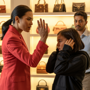 Ang kabataang babae, ang kanyang mga mata ay puno ng luha, ay sinubukang ipaliwanag: “Hindi ako nagnanakaw.” Ngunit ang kanyang mga salita ay naputol ng isang malupit na aksyon. Walang babalang itinaas ni Clare ang kamay at sinampal ng malakas si Zarya. Ang tunog ng sampal ay umalingawngaw sa buong tindahan, kaya napaatras ang ibang mga customer at empleyado sa katahimikan. Nakatayo roon si Zarya, natulala, ang kamay niya sa mukha, hindi maintindihan ang nangyari. Bata pa lang siya, at hindi niya kasalanan na nandoon siya.